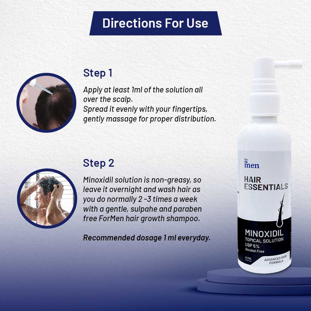 ForMen’s Minoxidil Topical Solution contain Minoxidil* 5% IP in Aqueous base. Minoxidil 5% is shown to be superior to 2% Minoxidil in men with Androgenetic Alopecia (AGA). Men using Minoxidil 5% experienced 45% more hair regrowth than 2% topical minoxidil at week 48. For more details on clinical studies, please check out the links below.
